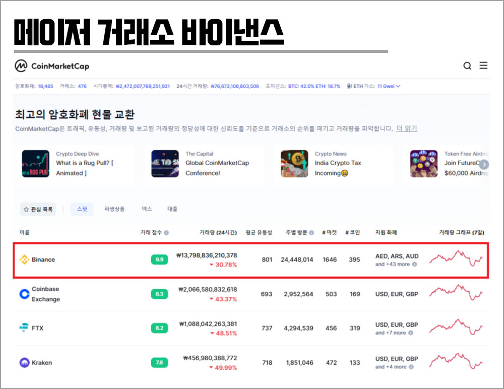 세계 최대 가상 자산 거래소 바이낸스는 코인마켓캡 기준 현물, 선물 모두 세계 1등 거래소이다.