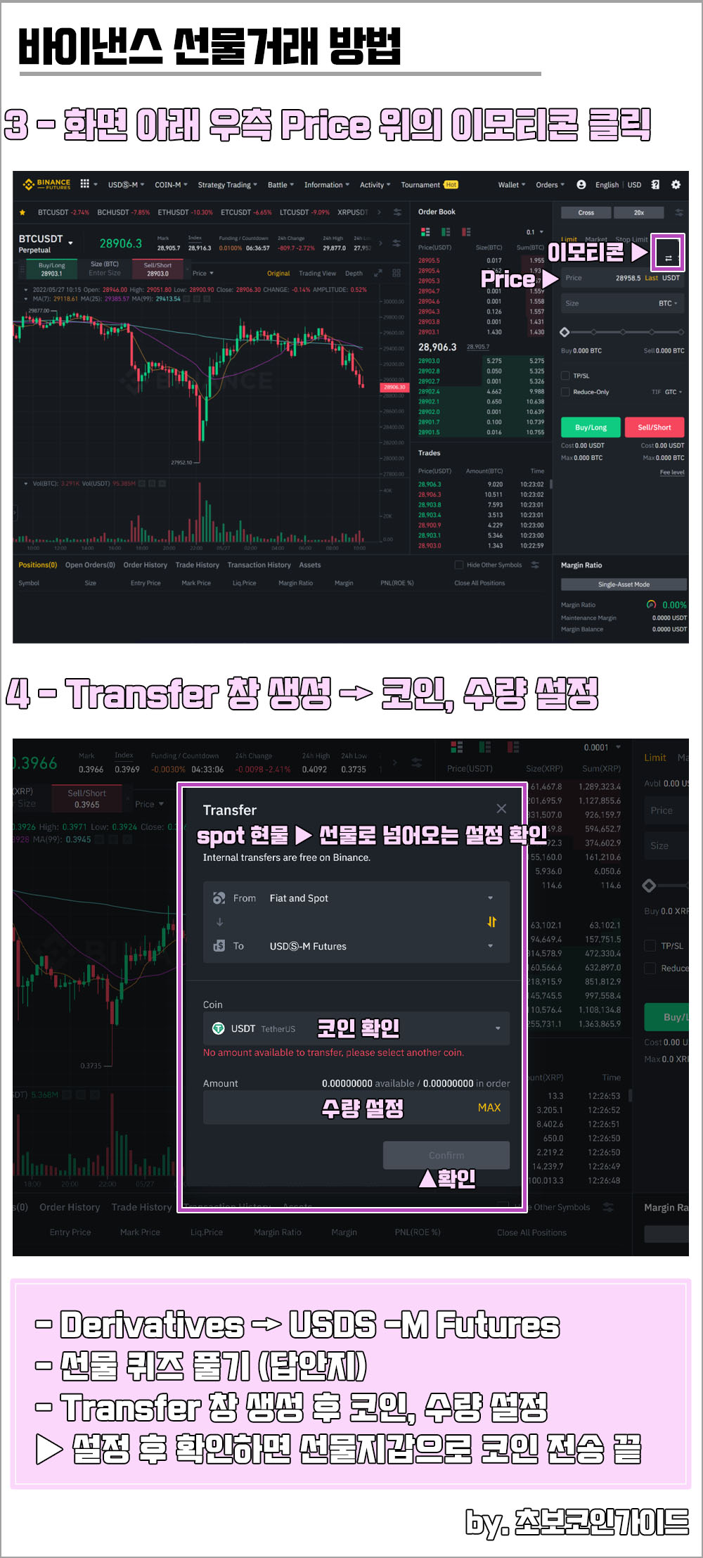 여기까지 선물 퀴즈를 완료한 후 Transfer를 활용하여 현물지갑에서 선물지갑으로 USDT 또는 선물거래 할 코인을 옮기면 된다.