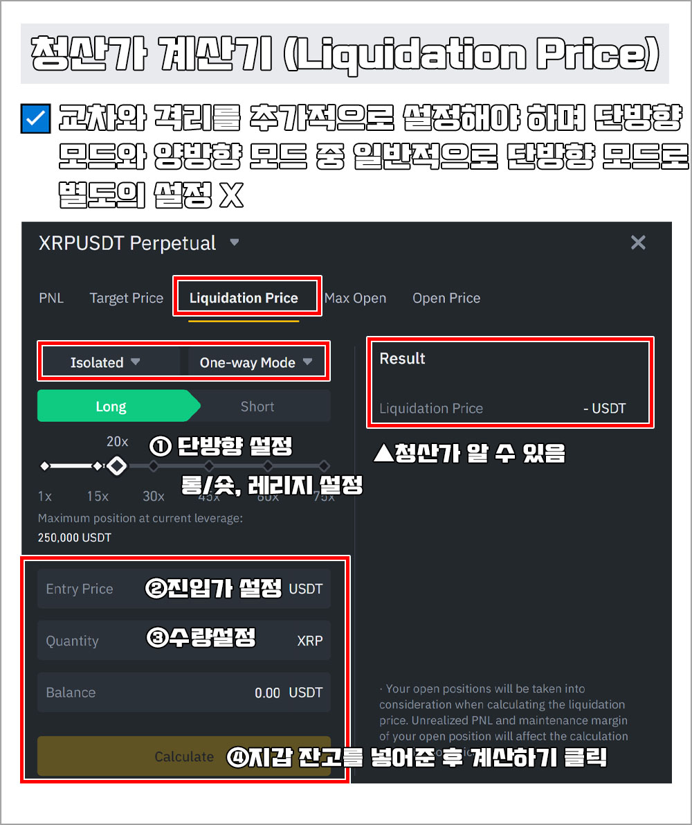 다른계산기와 다르게 교차와 격리를 추가적으로 설정해야 하고 양방향모드와 단방향모드가 있는데 대부분 단방향 모드로 거래를 하기 때문에 추가로 설정하지는 않아도 된다.