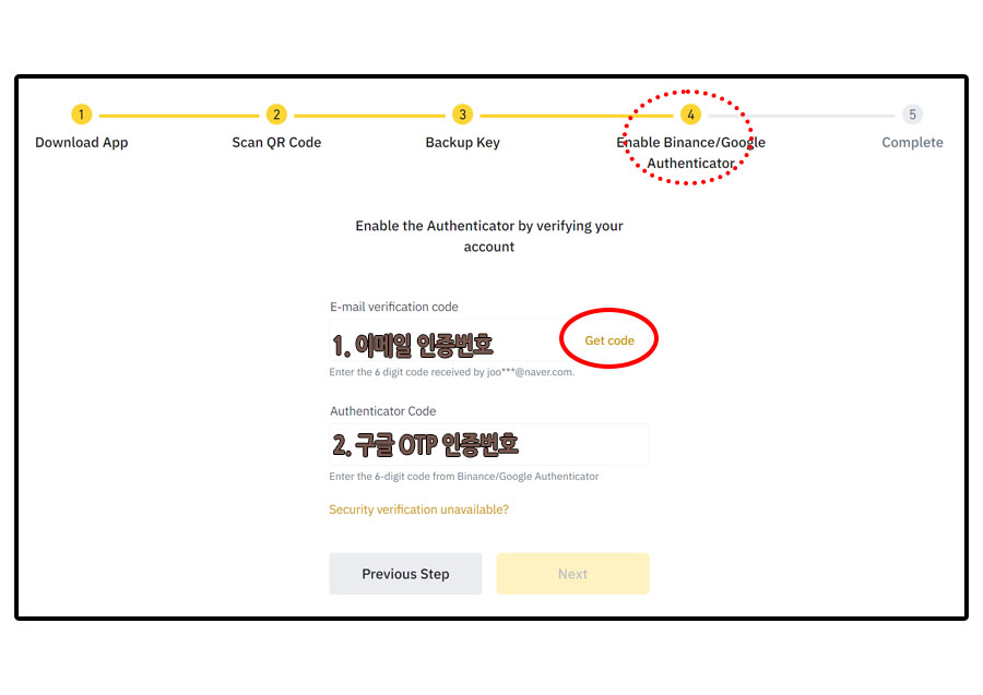 바이낸스/구글 OTP 활성화 버튼을 누르면 된다.
