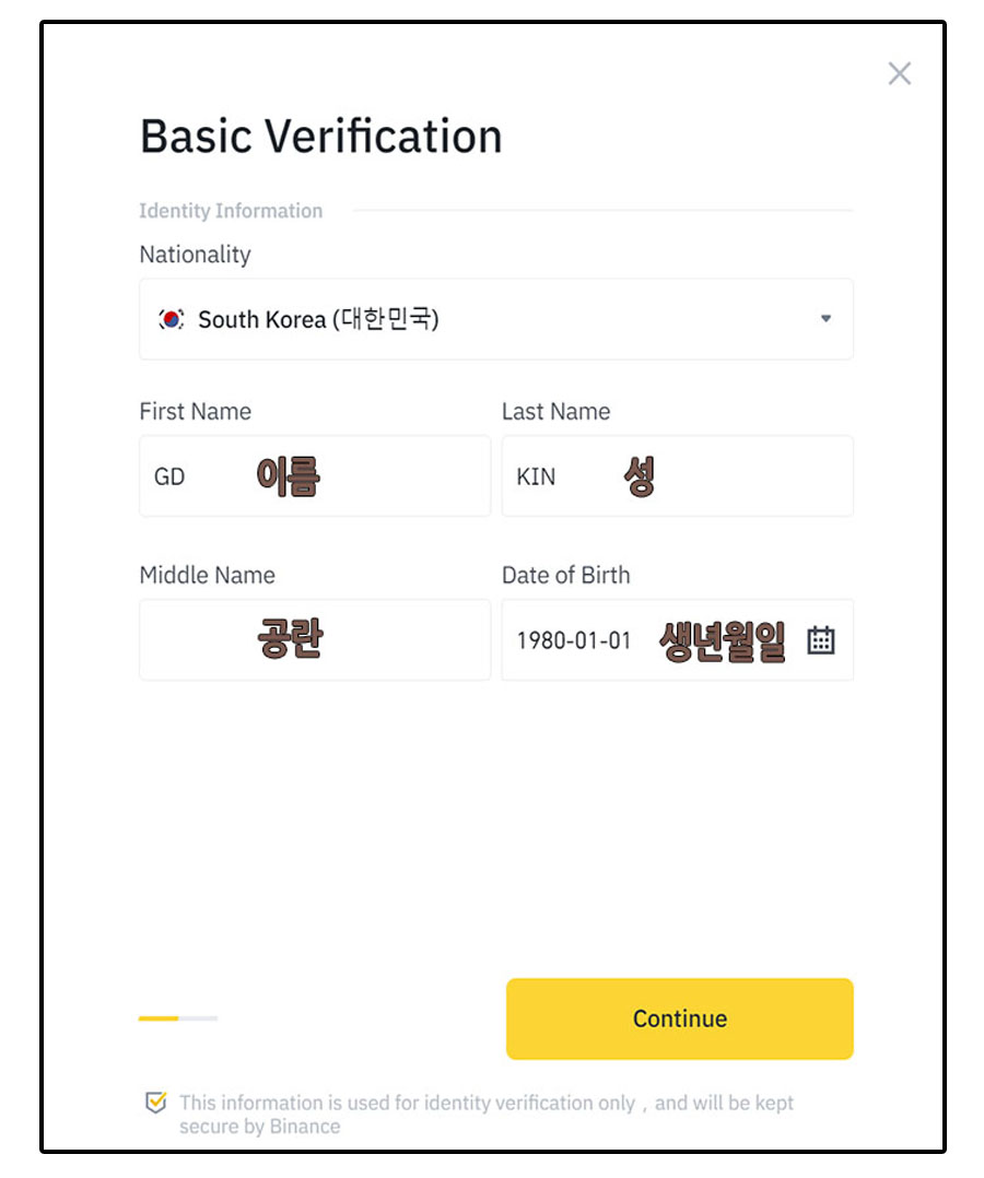 이름 / 성 / 생년월일을 입력한 후 Continue 계속하다를 클릭한다.