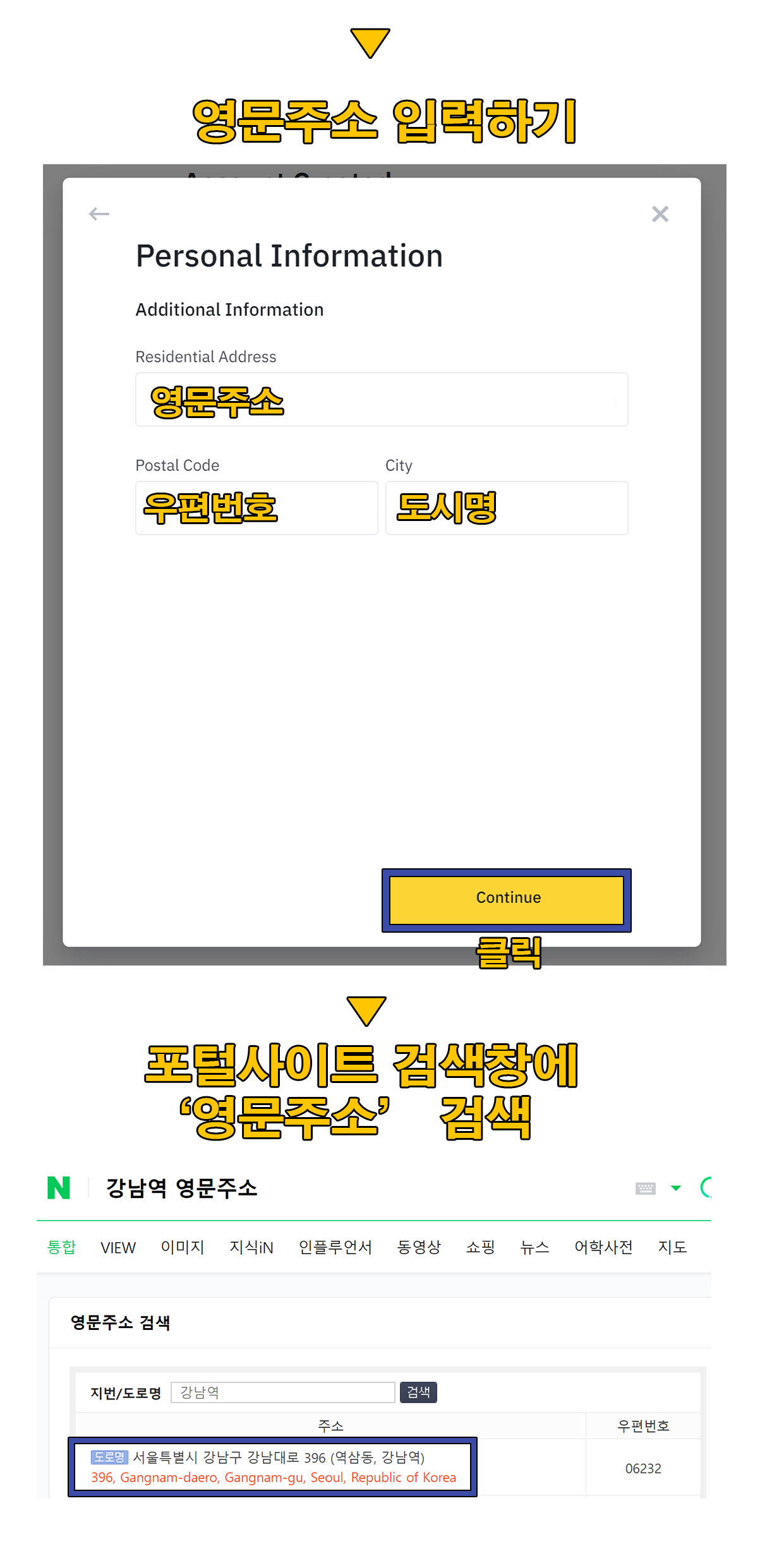 포털사이트 검색창에 '영문주소'를 검색하고 주소변환 창에 본인 주소를 입력하면 영문주소가 검색된다. 복사한 후 바이낸스 영문주소 입력창에 붙여넣기 하고 우편번호(숫자) 와 지역(도시명)을 영어로 입력한다.