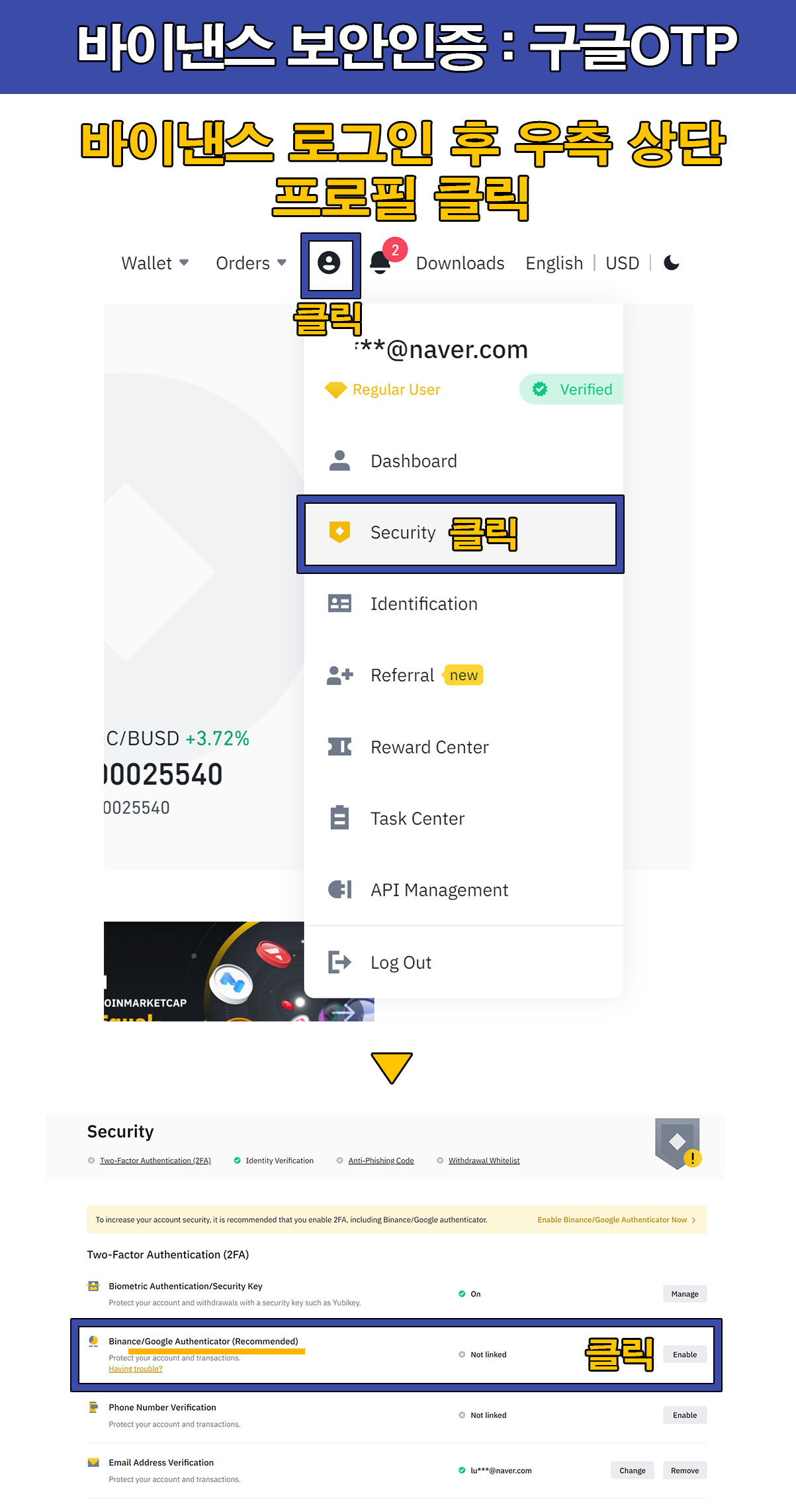 지난시간 바이낸스 가입하기 → KYC신원인증하기 까지 완료하였고 오늘은 신원인증이 완료되었다면 보안인증을 진행하려고 한다.