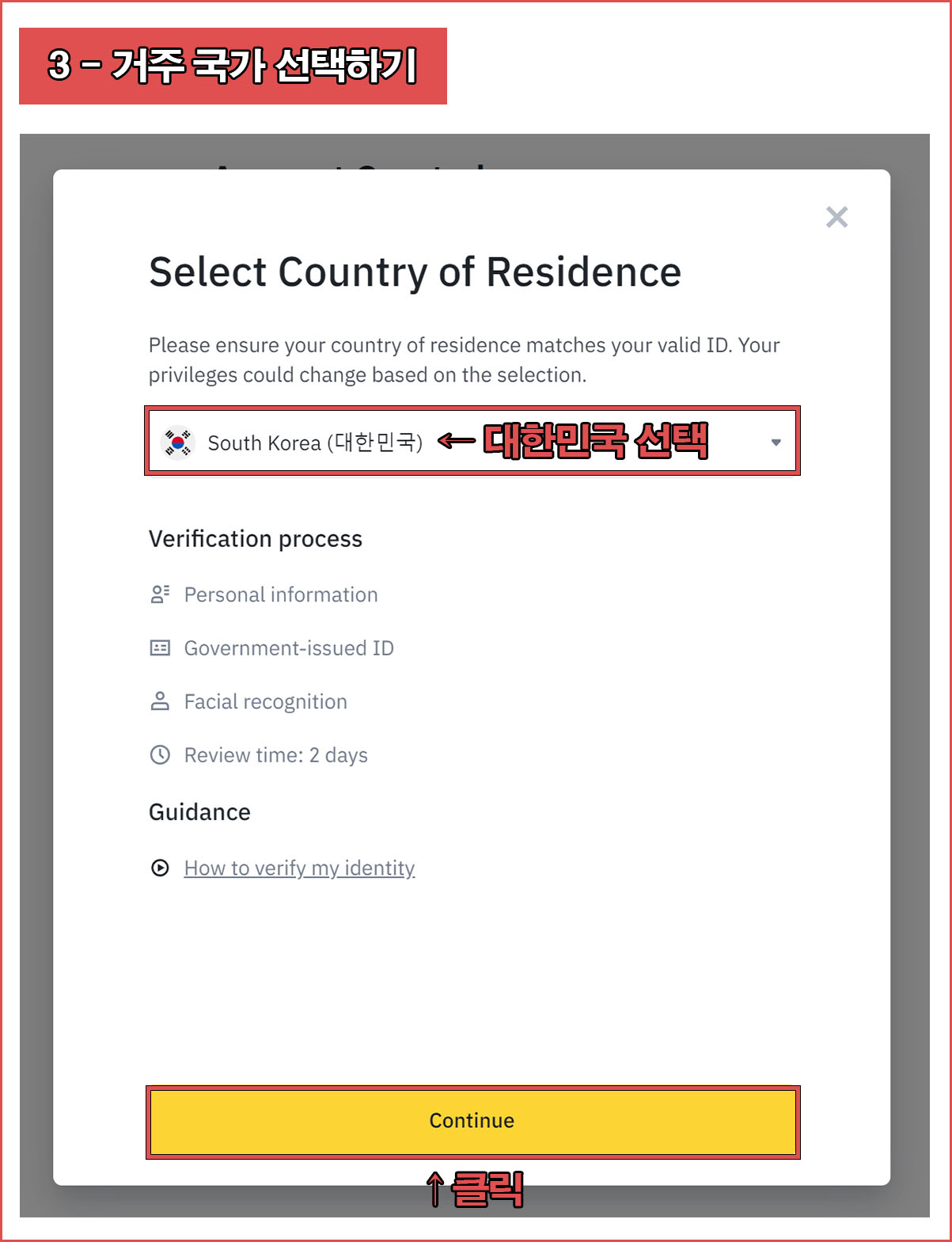 거주국가는 [South Korea- 대한민국]을 선택한 후 [Continue]를 클릭한다.