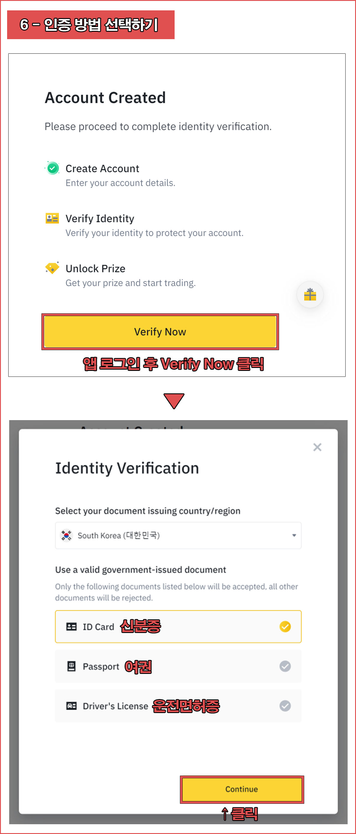 바이낸스 앱에 로그인 후[Verify Now]를 클릭한 다음 신분증 / 여권 / 운전면허증 중에 본인이 인증하기 편한 수단을 선택한다.