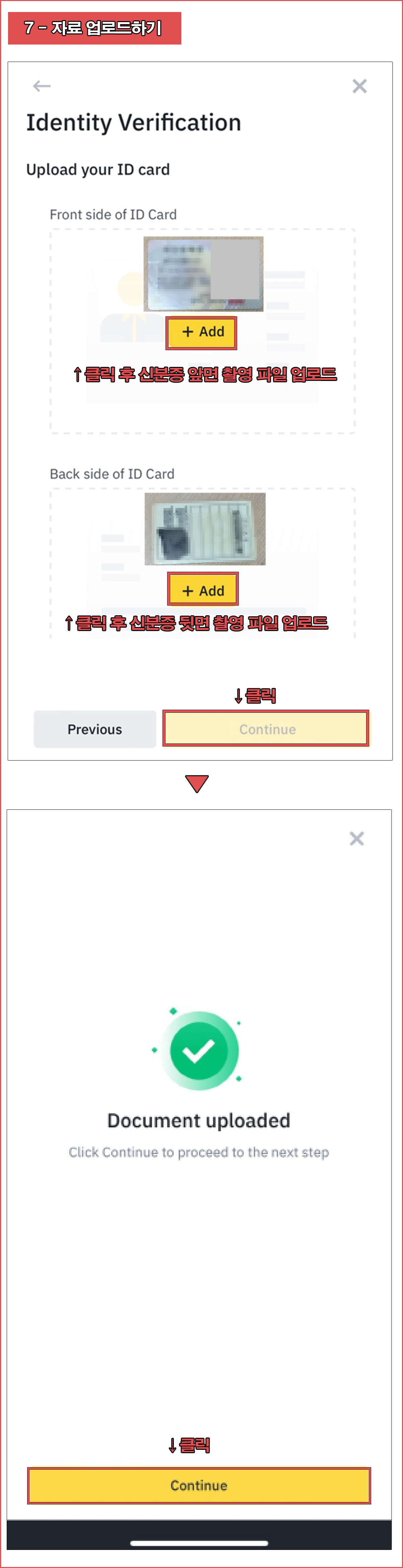 신분증으로 진행할 경우 +Add를 클릭하여 신분증 앞면 촬영 파일 1개, 신분증 뒷면 촬영 파일1개를 각각 업로드한다.