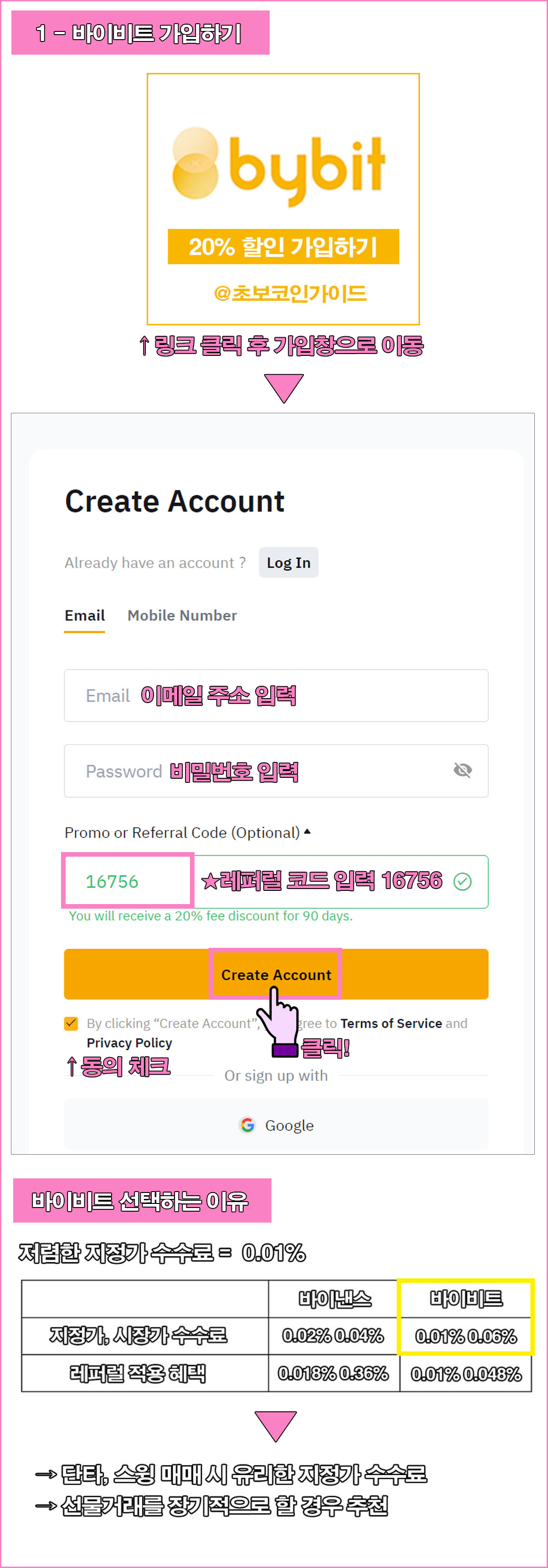1 - 먼저 초보코인가이드 공식 레퍼럴 링크를 통해 이동 시 자동으로 레퍼럴 코드 16756이 입력되고 수수료 20% 할인 혜택이 적용된다.