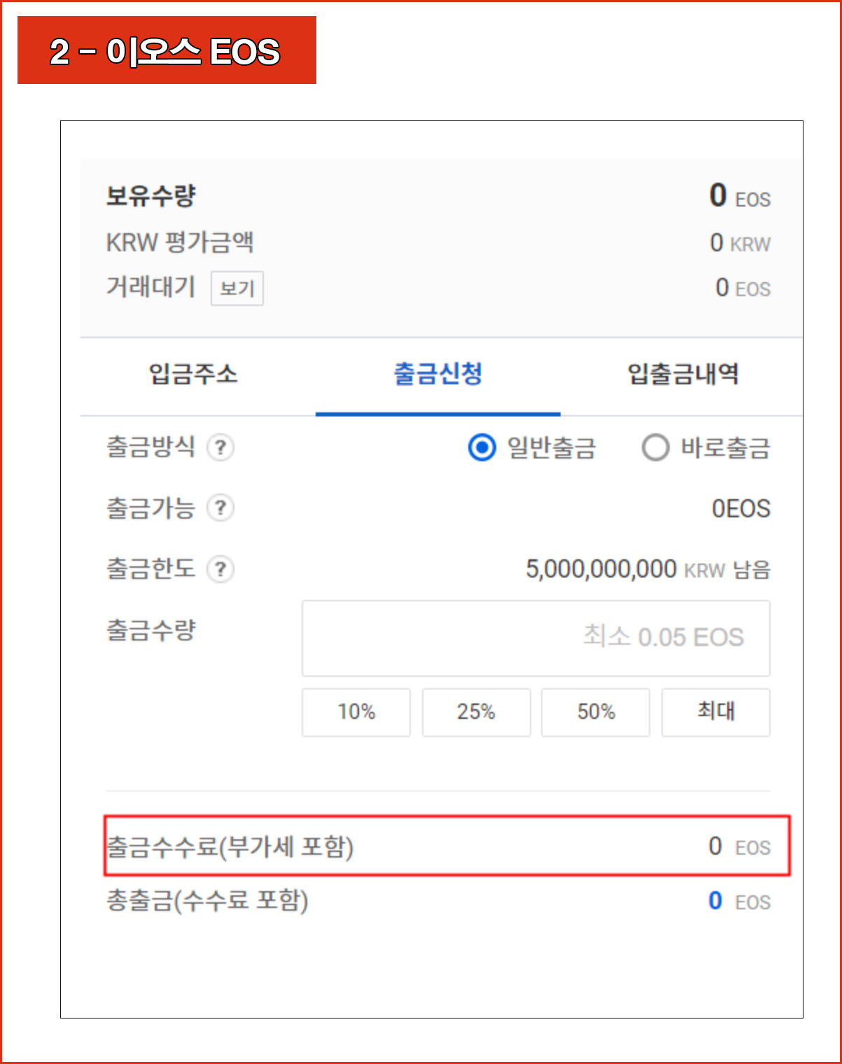 이오스가 업비트에서 출금 수수료 0원으로 가장 저렴하고 그 다음은 스텔라루멘 그 다음은 트론 마지막으로 리플이다.