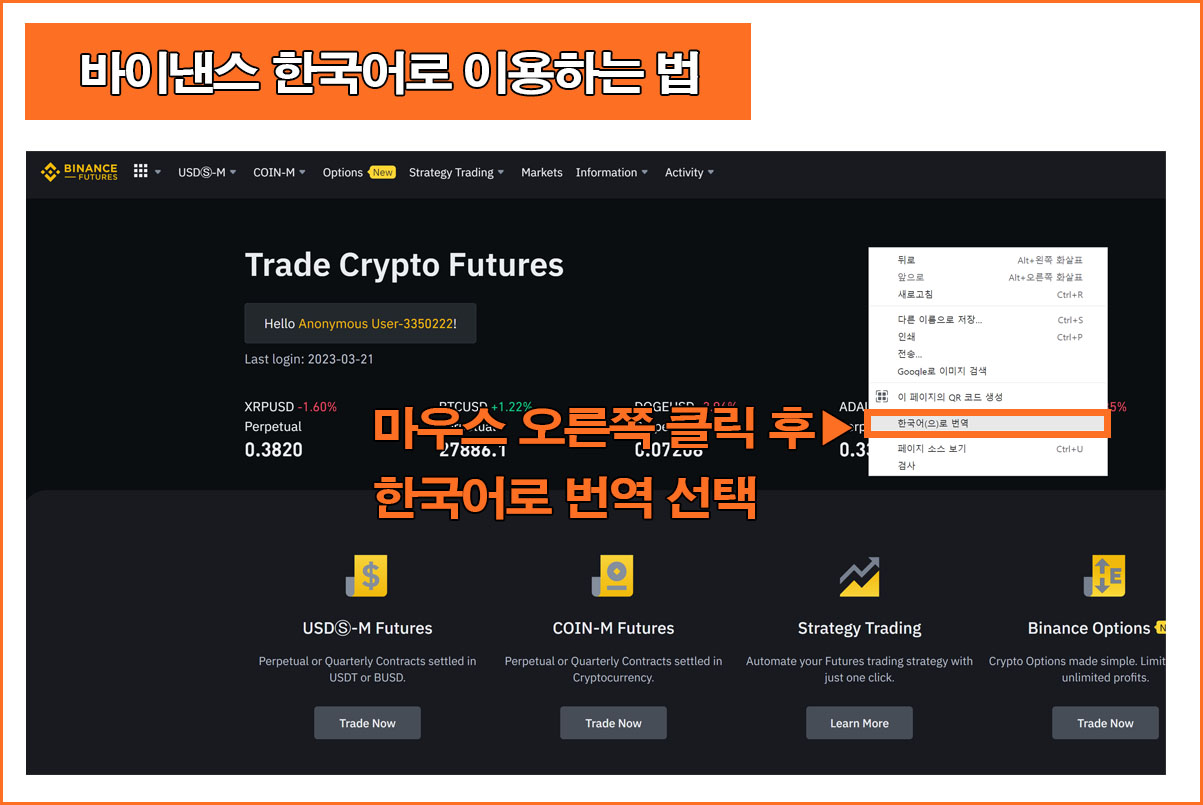 구글 크롬 브라우저로 바이낸스에 접속한 후 거래소 화면에 대고 마우스 오른쪽을 클릭한 다음 한국어로 번역탭을 선택하면 된다.