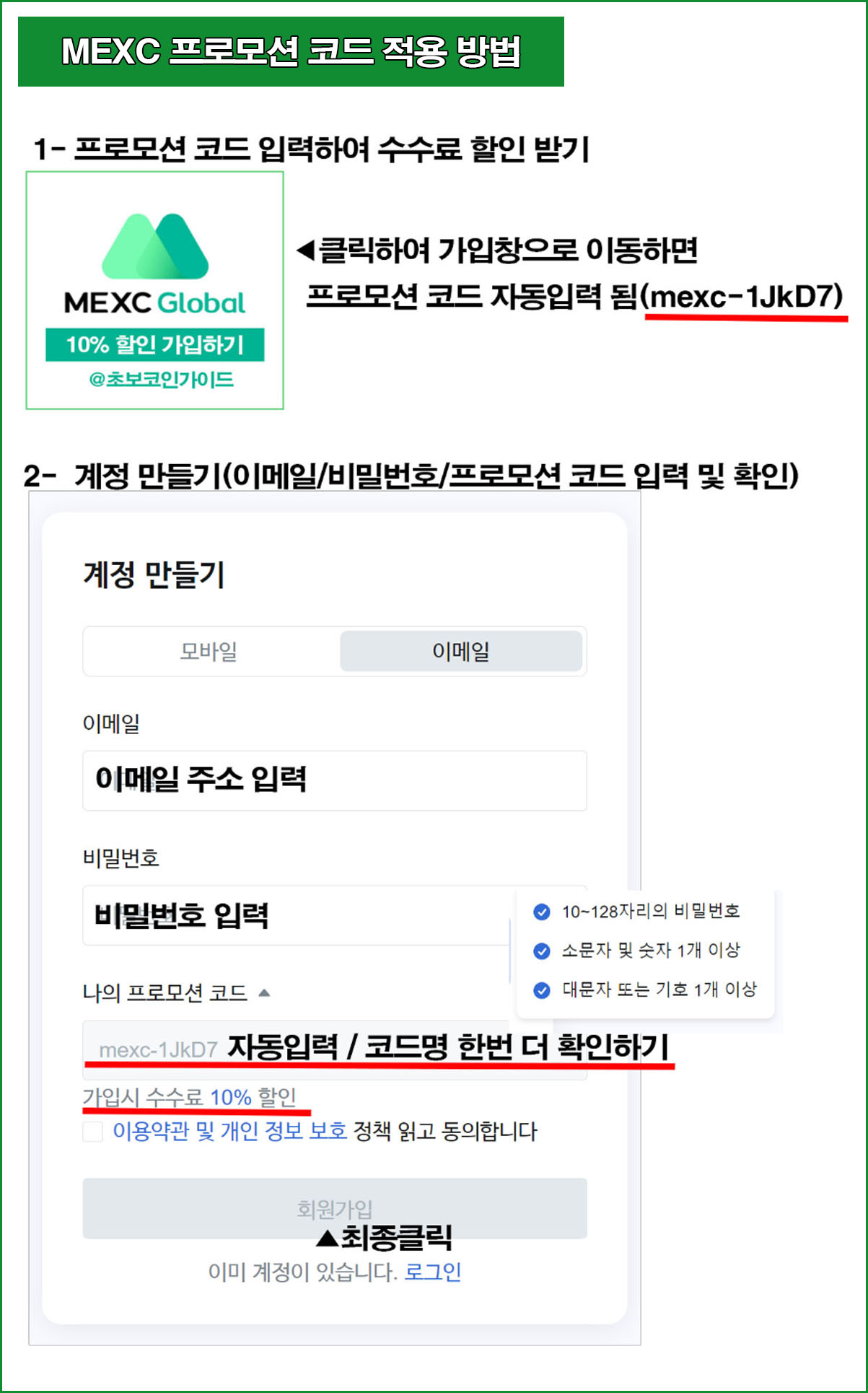 MEXC 거래소 - 초보코인가이드 할인 링크를 타고 접속하여 자동으로 입력된 프로모션 코드 mexc-1JkD7 적용 후 가입을 한다.