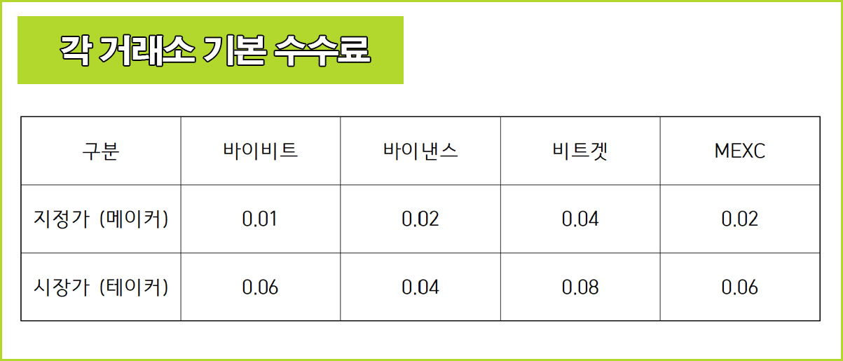 기본 수수료는 각 거래소에서 제공되는 수수료 할인 링크를 적용하지 않았을 때의 수수료이다.