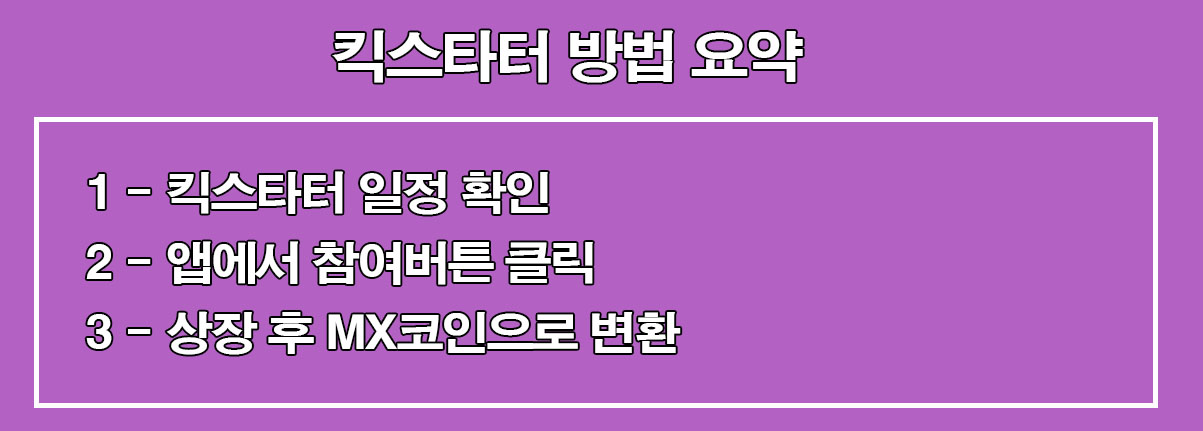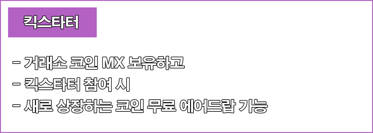 킥스타터는 멕쓰시 거래소 코인인 MX를 보유하면 킥스타터에 참여가 가능한데 이 때 새로 상장하는 코인을 무료로 에어드랍을 받을 수 있다.