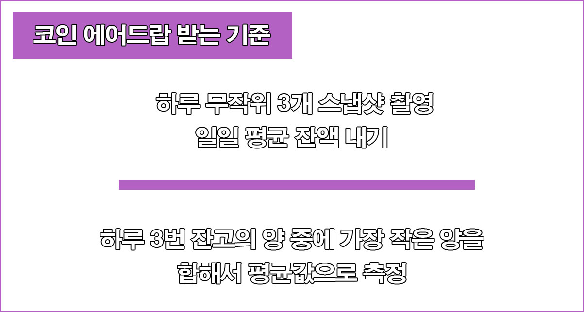코인 에어드랍을 받는 기준은 하루 3번 잔고의 양 중 가장 작은 양을 합해서 평균 값으로 측정한다. 하루에 무작위로 3개의 스냅샷을 촬영하고 일일 평균 잔액을 내면 되기 때문에 잔고를 넣었다 뺐다 하는것은 하지 않는게 좋다.