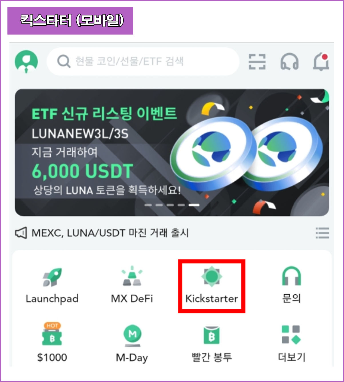 먼저 킥스타터 일정을 공식 텔레그램방에서 상시 공지를 하기 때문에 확인하면 되고 앱에서 참여버튼을 클릭한다. 상장 후 MX코인으로 변환하면 된다.