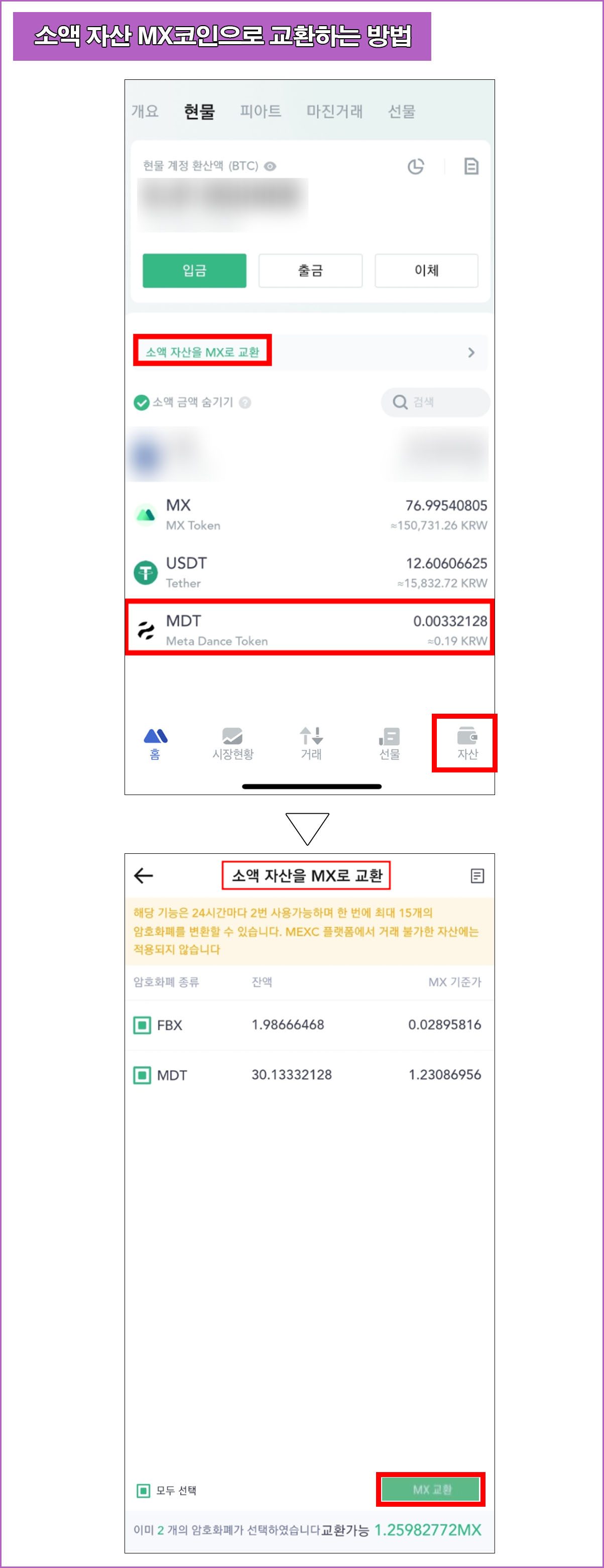 자산탭에서 교환버튼을 클릭한다. 일정금액 이하의 소량의 코인은 직접 매도가 불가능하기 때문에 정해진 만큼 구입 후 한번에 매도해도 된다. 하루에 5-7개씩 있는 경우도 있기 때문에 매주 일정 확인 후 참여하면 소액투자로 하기에 적합하다.