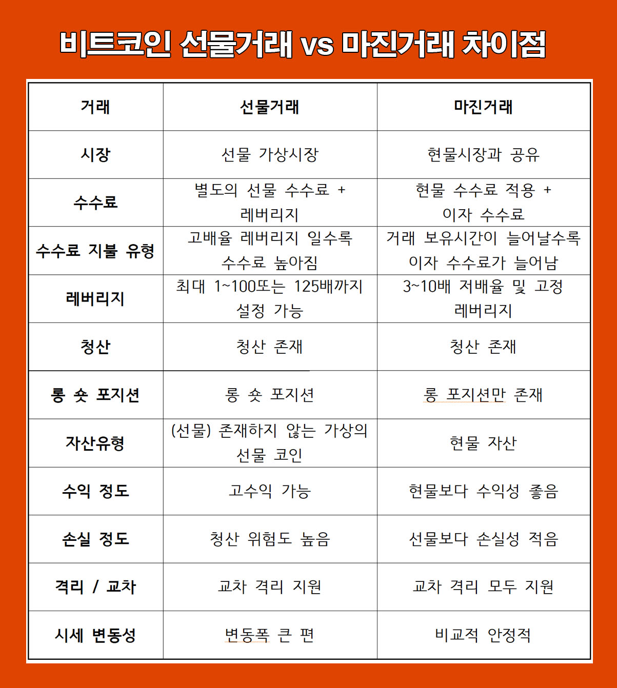 비트코인 선물거래와 마진거래는 모두 파생상품이며 레버리지를 활용하여 높은 수익을 발생시킬 수 있고 반대로 청산 또는 큰 자산 손실이 발생할수도 있다.