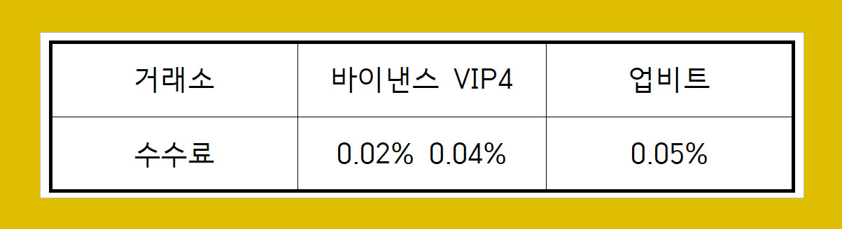 바이낸스와 업비트 수수료는 거래 방식에 따라 수수료 차이가 각각 다르다. 현물 수수료는 바이낸스가 업비트보다 2배 높으나 아래 표처럼 VIP 등급을 적용할 경우 업비트보다 저렴한 수수료에 이용 가능하다.