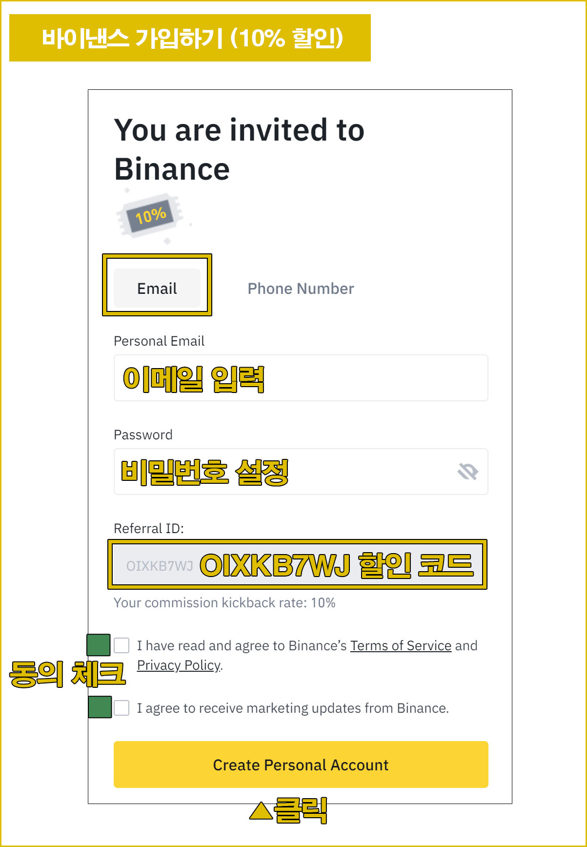 이메일 주소를 입력하고 비밀번호 (대+소문자+특수+숫자 조합) 입력 후 레퍼럴 ID에서 OIXKB7WJ를 입력하고 수수료 할인 비율 10%를 확인 후 동의사항에 체크 후 Create Personal Account를 클릭하여 가입한다.