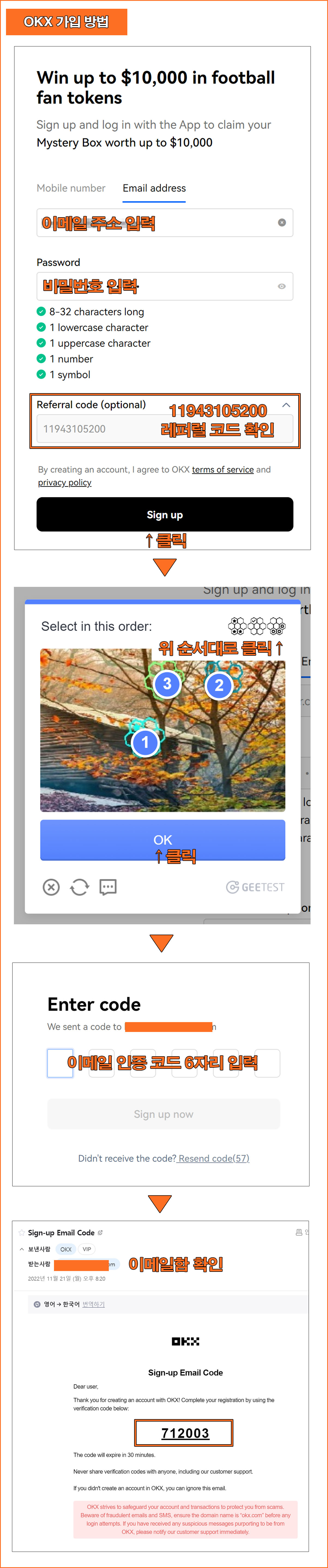 가입 시 휴대폰번호 또는 이메일 주소 중 편한 방법으로 가입하면 되고 비밀번호는 8~32자리로 특수문자, 숫자, 영어대소문자를 섞어서 만들면 된다. 그 다음 레퍼럴 코드를 다시 한번 확인 후 최종 Sign up을 클릭하면 퍼즐을 맞추라는 창이 뜬다.