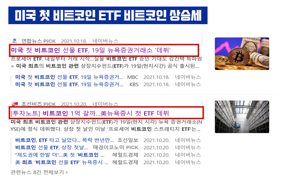 더불어 미국 최초의 비트코인 관련 상장지수펀드 ETF 거래가 시작된 영향으로 비트코인이 상승세 흐름을 되찾고 날개를 달고 날았다. 기초 자산으로 설계된 상품이지만 가상화폐가 월가의 주류 금융시장에 진입해다는 이정표로 받아들여졌다는 것이다. 일반 증권회사들이 다른 ETF 상품들처럼 손쉽게 비트코인에 간접투자를 할 수 있게 돼어 수요가 늘어날 것이라는 기대감이 호재로 작용한 것이다.