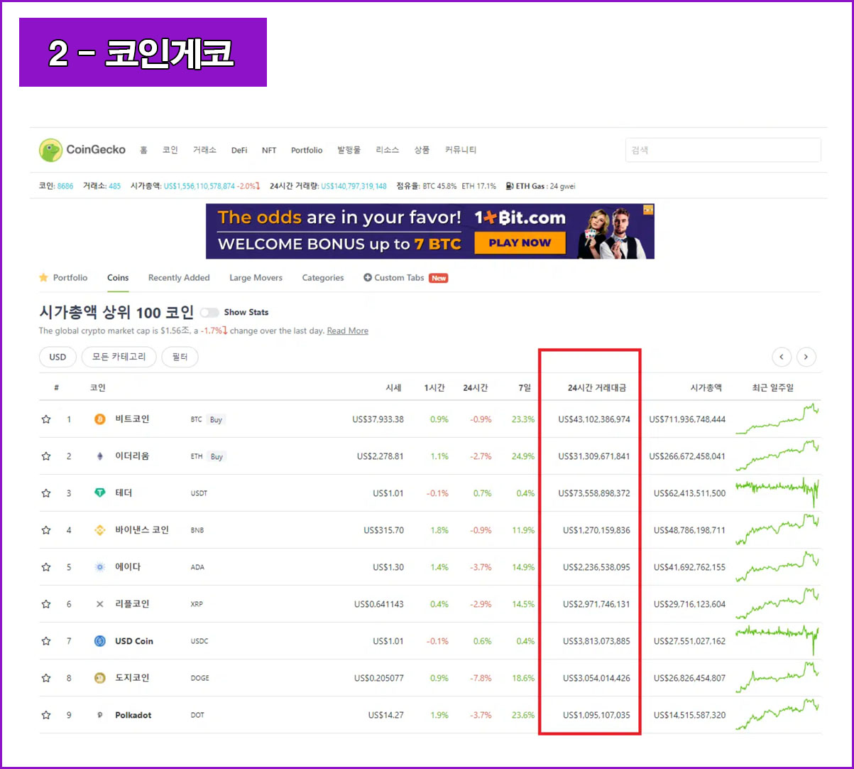 코인마켓캡처럼 다양한 코인 정보를 확인할 수 있으며 시세, 1시간, 24시간, 7일 24시간 거래대금, 시가총액 등을 알 수 있다. 하루 동안 전체 거래소에서 얼만큼의 거래량이 발생했는지 확인 가능하다.