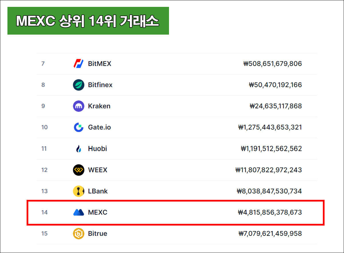MEXC거래소는 코인마켓캡 기준 14위 거래소로 한국어를 지원하는 거래소로 국내 사용자들이 이용하기 매우 편리하다는 장점이 있다. 또한 다수의 코인들이 상장되어 있고 다양한 코인플랫폼을 보유하고 있다.
