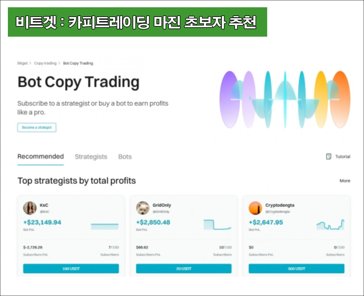 비트겟 거래소는 모의투자, 카피트레이딩, 편리한UI/UX 제공으로 인기 거래소 중 하나이다. 특히 마진초보자들을 위해 카피트레이딩 시스템을 활용하면 큰 손실 걱정을 줄이고 수익을 낼 수 있다. (수익 발생의 일부 팔로우한 트레이더에게 지급)