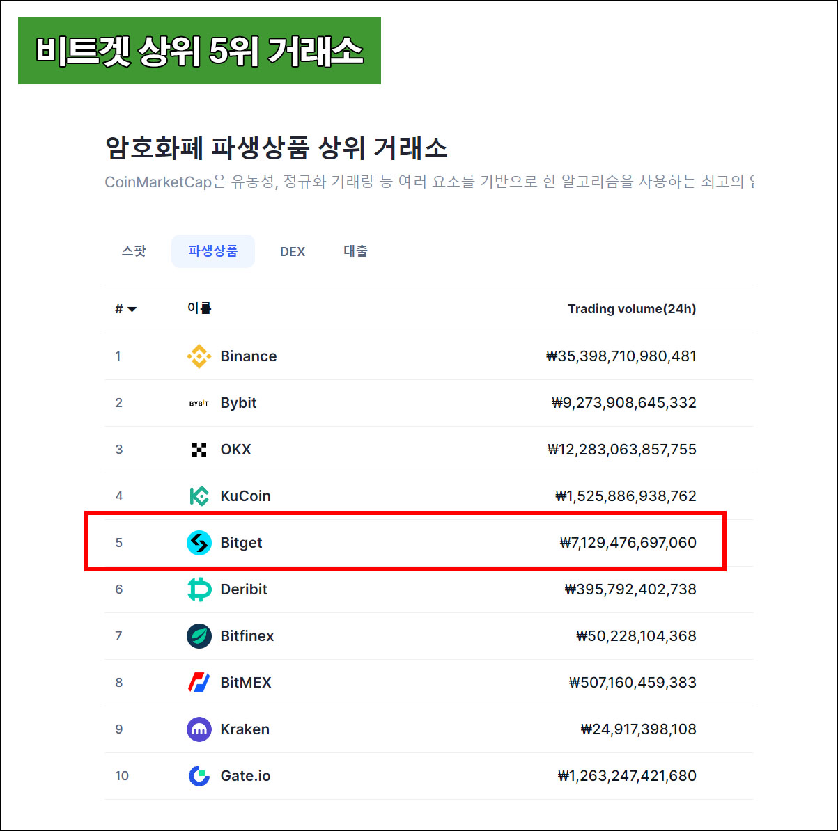 수수료 부담이 적은 곳으로 파생상품 부분에서 전 세계 2위를 유지하고 있다.  바이비트는 메이저 대형 거래소로 많은 거래량을 인증하며 안정적인 거래소임을 알 수 있다.