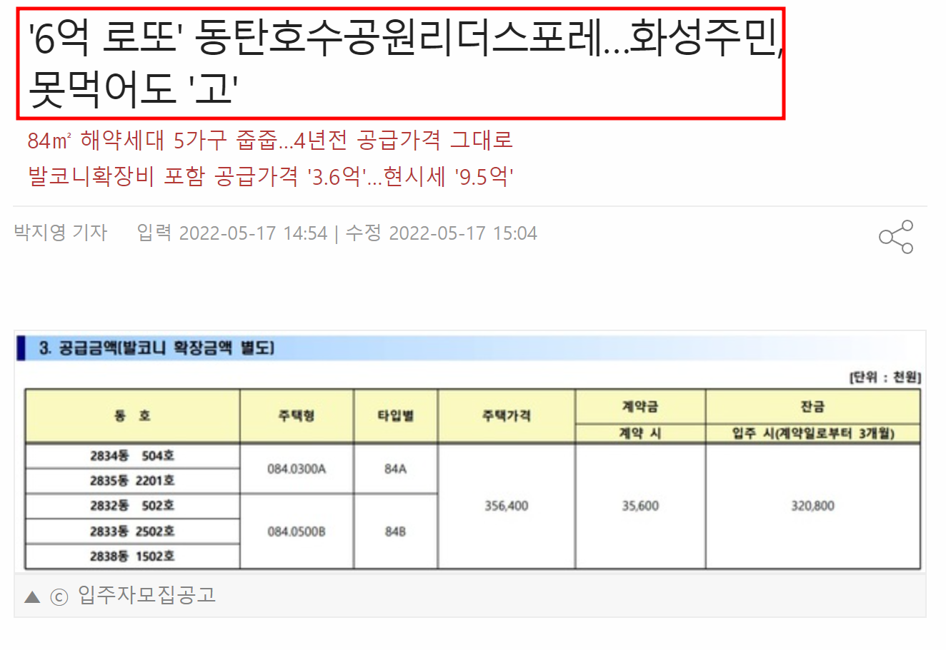 2022년 5월 기준 9억 5000만원에 매수인을 구하고 있었고 발코니 확장비까지 합치면 최소 4억 8000만~최고 5억 8000만원의 시세차익을 거둔셈이다.
