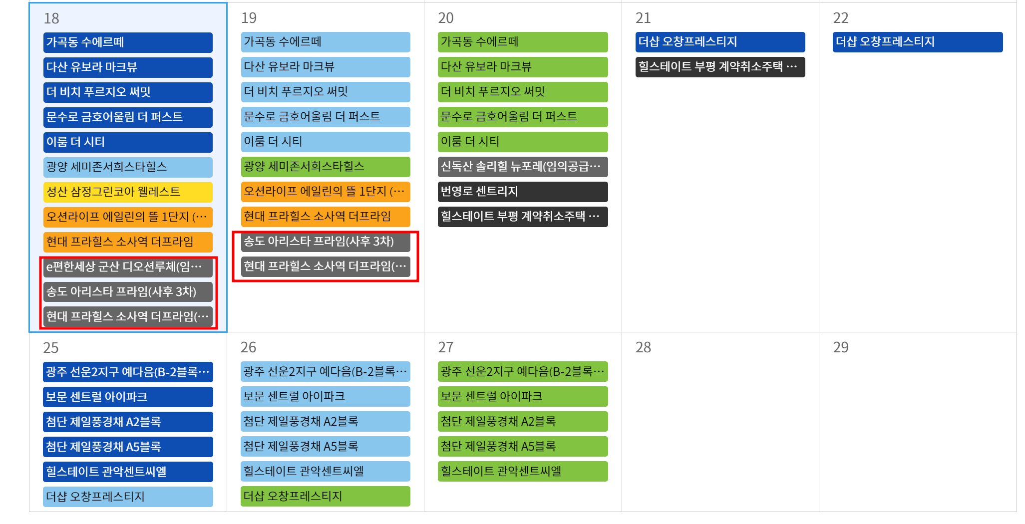회색박스에 무순위라고 표시가 되어있으며 캘린더에서 회색박스를 찾으면 이번달 무순위 아파트를 알 수 있다.