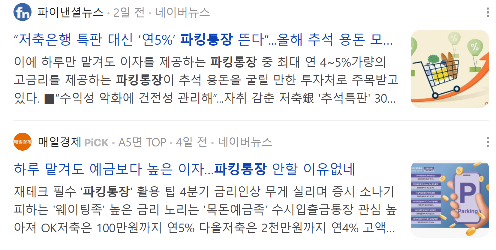 최근 시중은행이나 저축은행에서 고금리 파킹통장이 많이 출시되고 있다. 연 4%금리경쟁으로 OK저축은행은 5%금리, DB저축은행은 4%에 육박하고 있다.