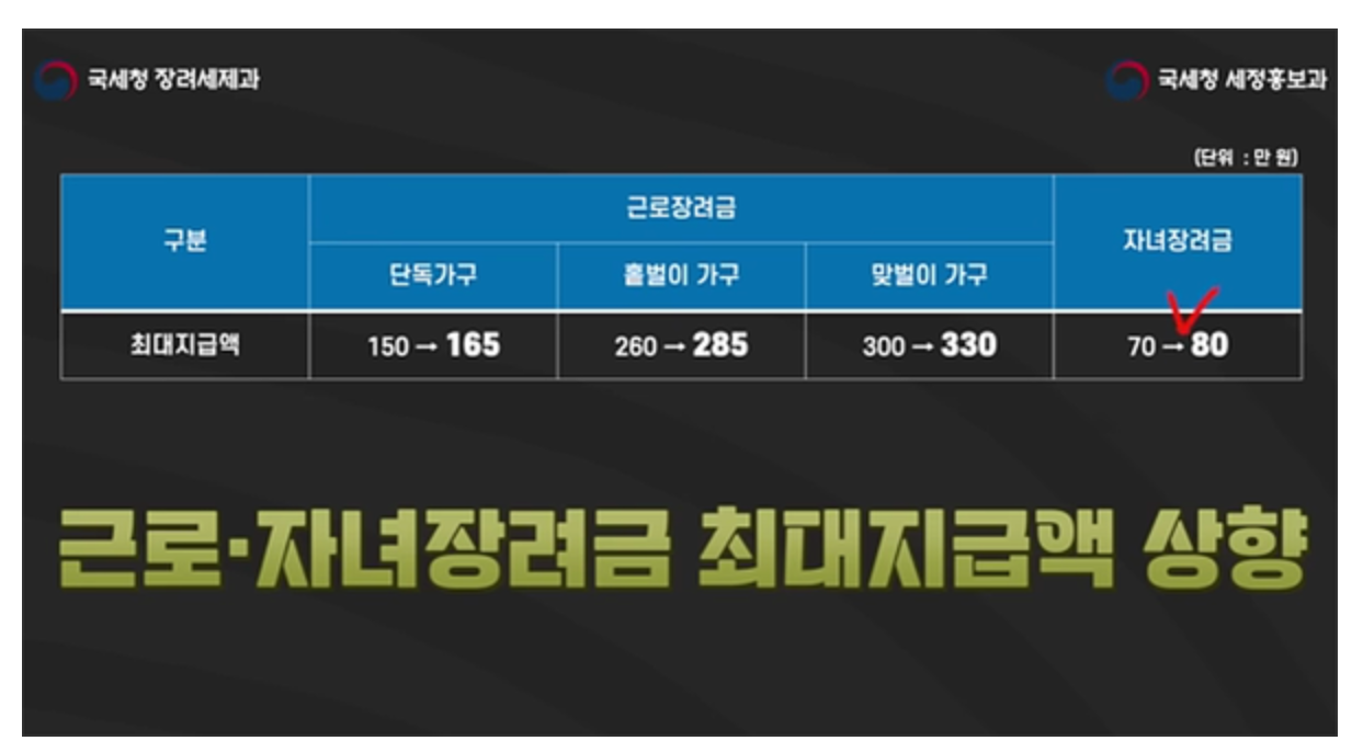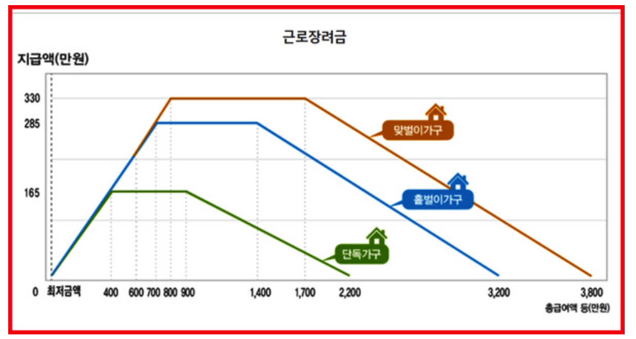 근로를 장려하기 위해 근로자들의 소득을 지원해주는 소득 지원 제도의 개념이다. 가구원 구성, 근로소득, 사업소득, 종교인소득에 따라 산정된 근로장려금을 지급하며 가구유형, 소득금액에 따라 165만원에서 330만원까지 차등 지원을 받을 수 있다.
