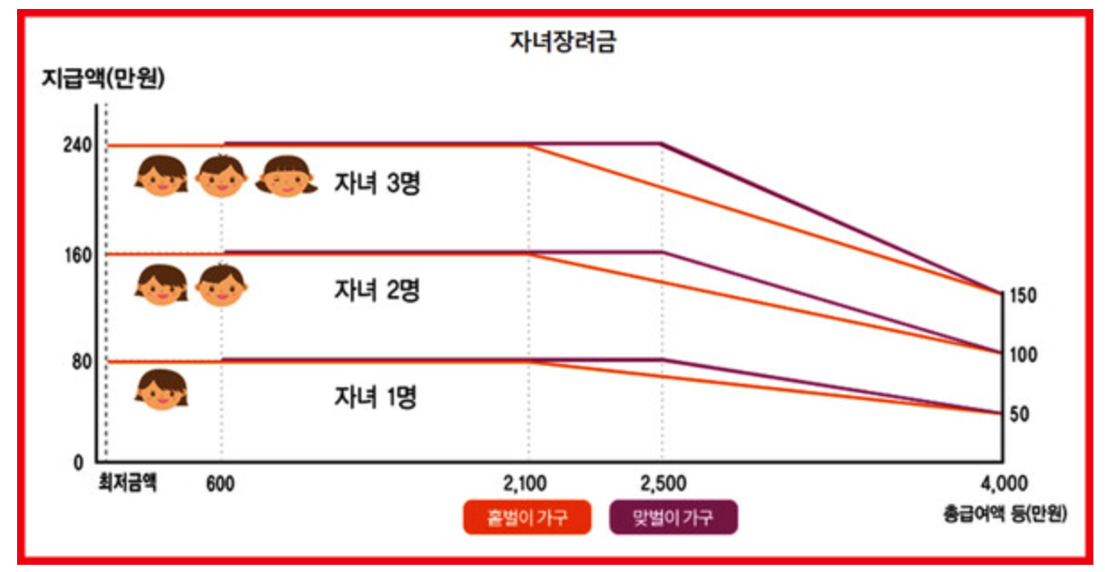 - 홑벌이가구와 맞벌이가구는 총소득기준금액은4,000만원 미만으로 최대지급액은 자녀 1인당 80만원(최소 50만원)
