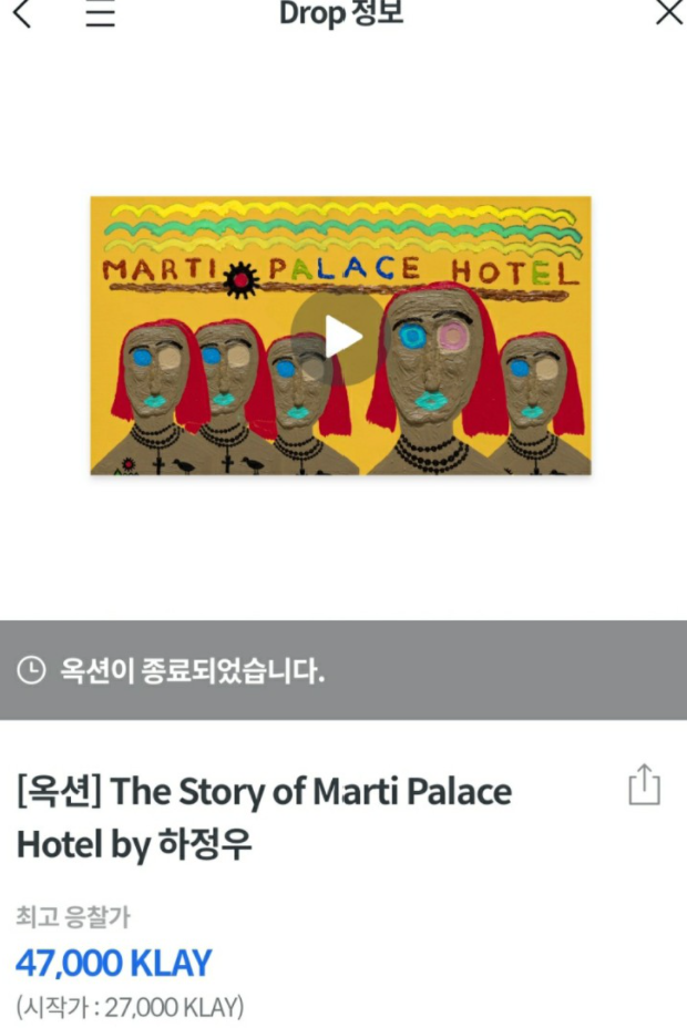 위 하정우님의 작품은 4만 7천클레이에 낙찰되었다. 클레이튼 코인 시세가 1200원 정도였으니 5600만원이다. 현재 클레이튼 코인 시세는 2200원이니 하정우님이 수령한 클레이의 가치는 1억원이 넘는 평가액을 가지고 있다고 볼 수 있다.
