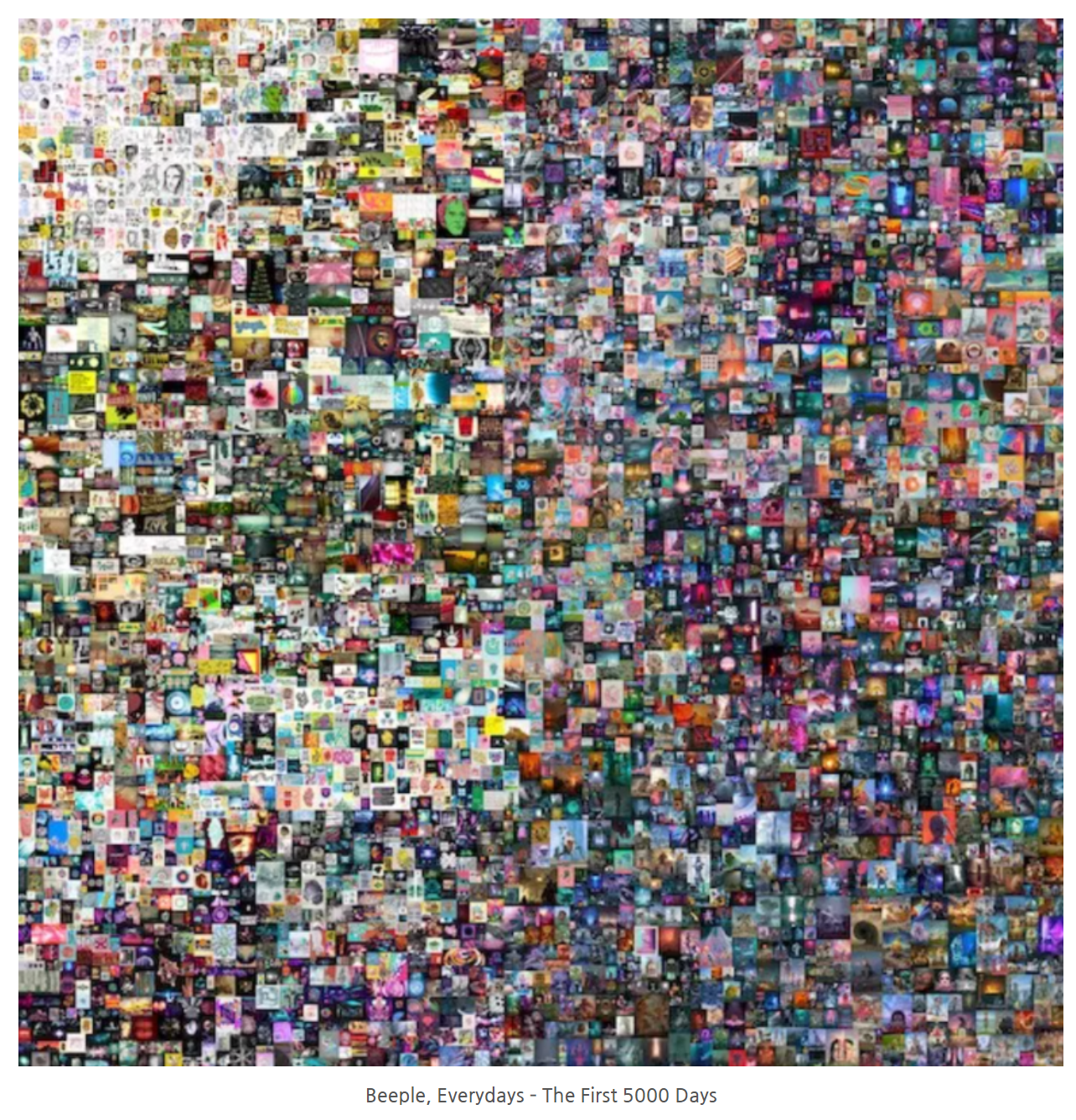 위 작품은 미국 아티스트 비플, <에브리데이즈 - 첫 5000일>로2007년부터 온라인에 올린 모든 이미들을 5,000일 동안 모아 만든 콜라주 작품이다. 뉴욕타임즈에 따르면 100달러에 시작된 경매가 최종적으로 3000만달러 이하에서 낙찰되려는 순간 마지막에 33명 정도의 입찰자들이 뛰어들며 현존하는 예술가 중 세번째로 높은 가격에 낙찰되었다.