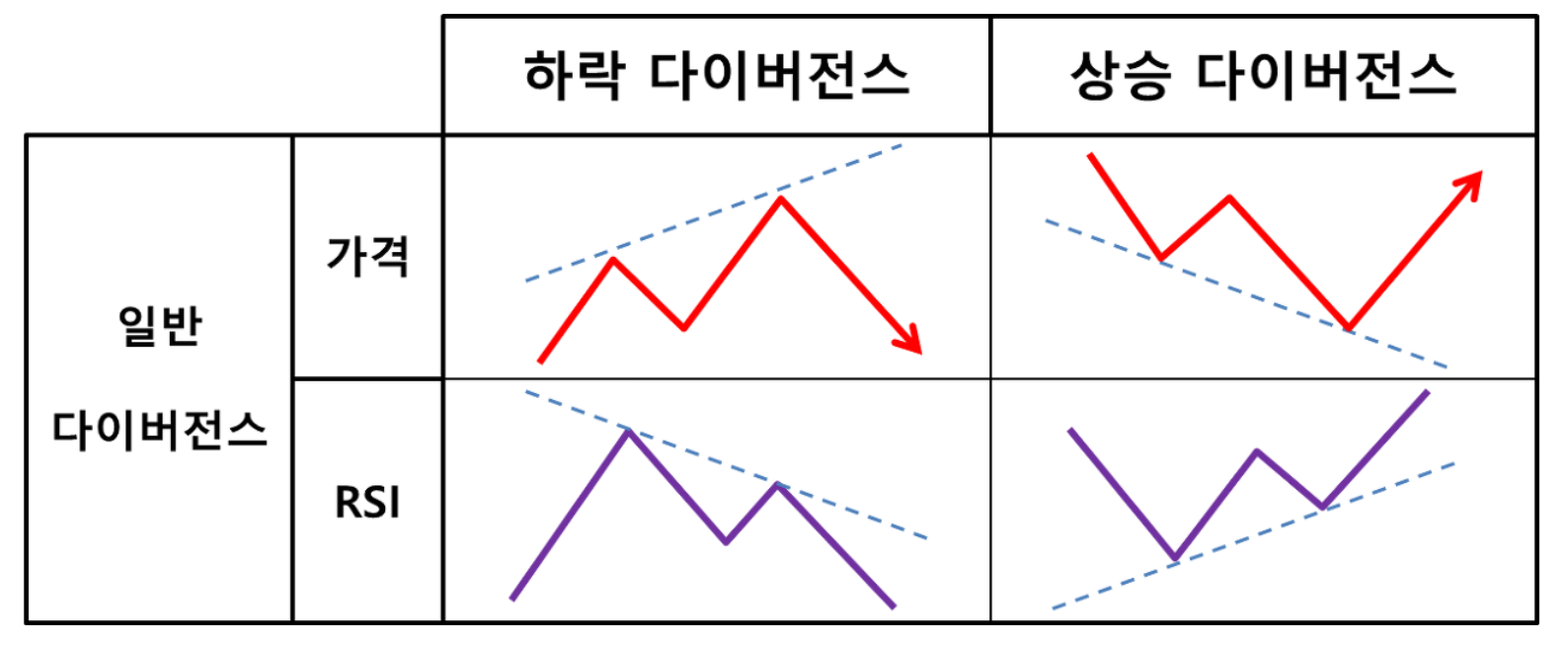 일반 하락 다이버전스는 종목의 고점은 높아졌는데, RSI의 고점은 떨어지는 것으로 추세가 곧 하락 추세로 전환됨을 뜻한다. 일반 상승 다이버전스는 종목의 저점은 낮아졌는데, RSI의 저점은 올라가는 것으로 추세가 곧 상승 추세로 전환됨을 뜻한다.