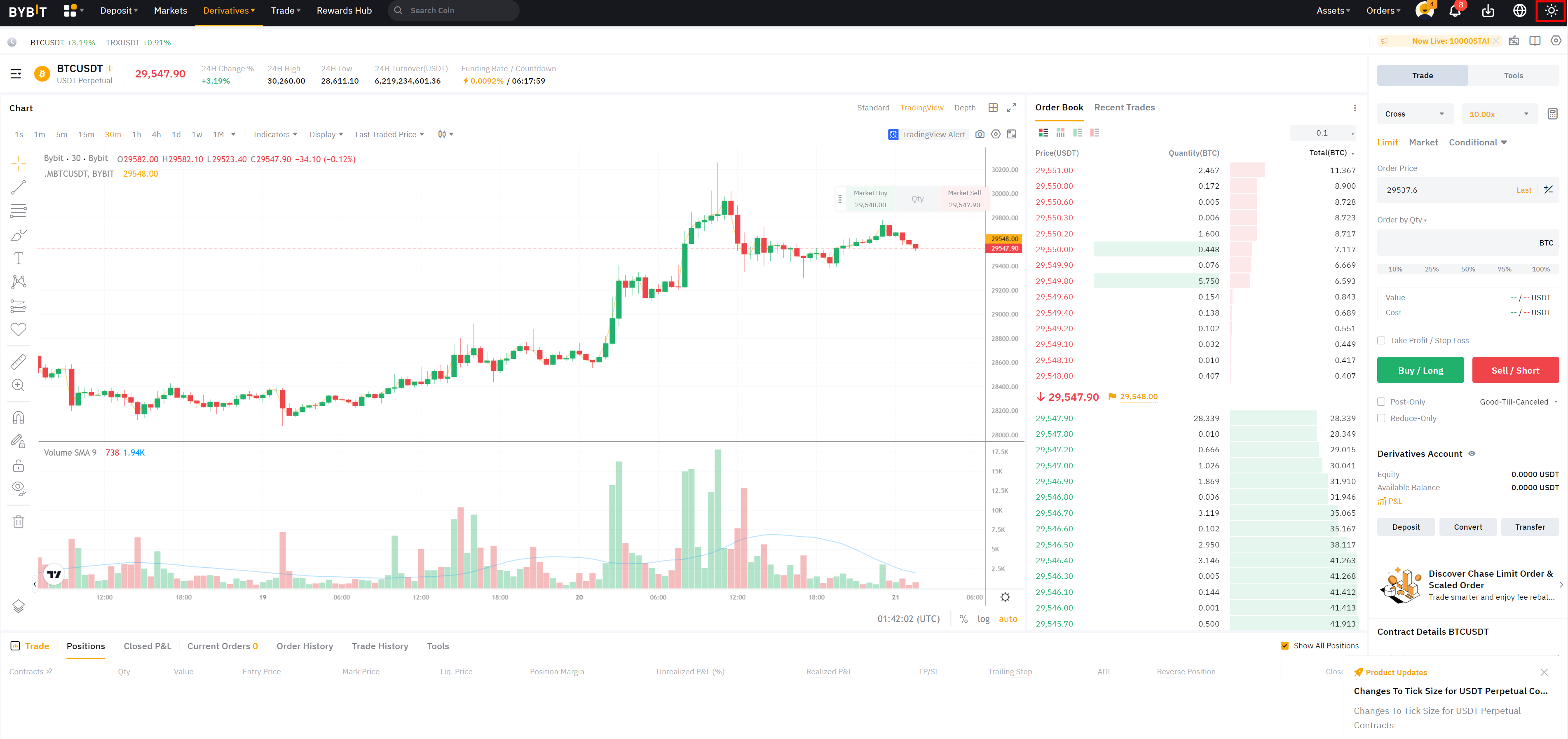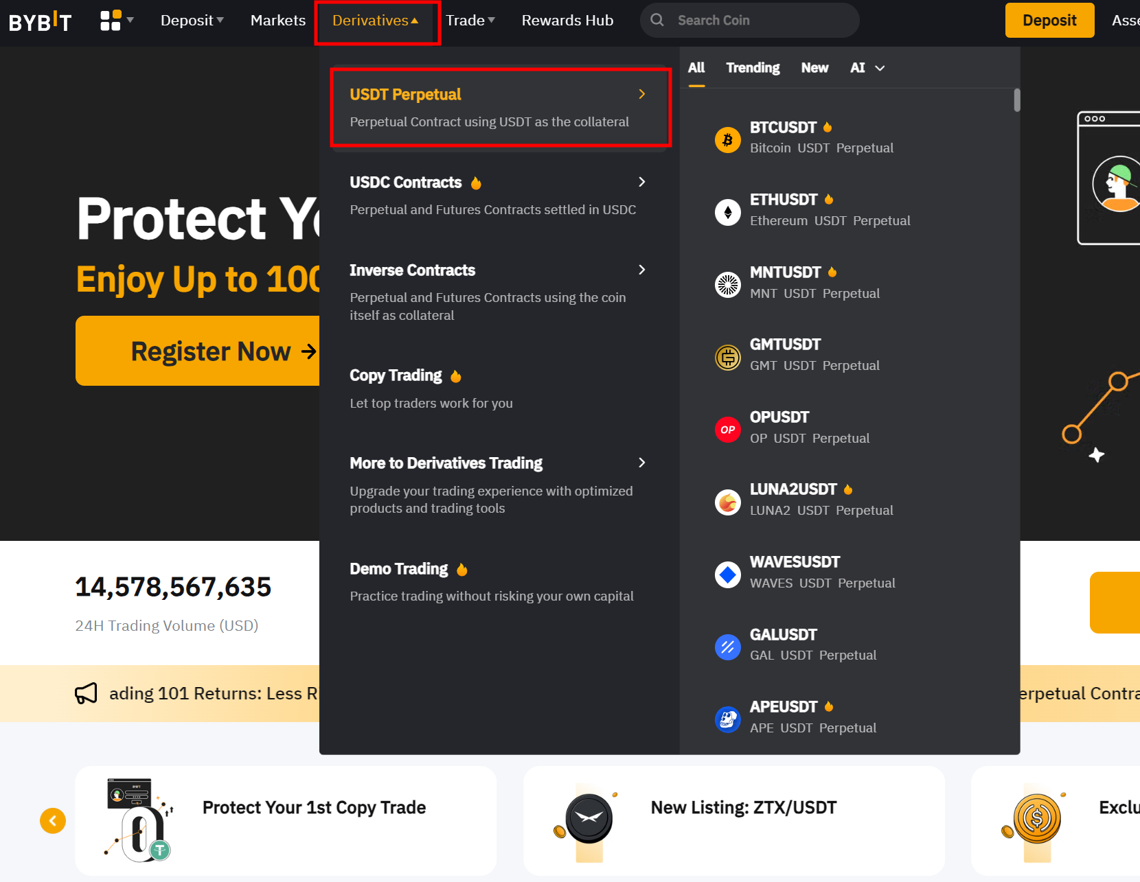 차트를 설정하려면 바이비트 초기 화면의 메뉴바에서 Derivatives를 클릭 후 USDT Perpetual을 클릭한다.