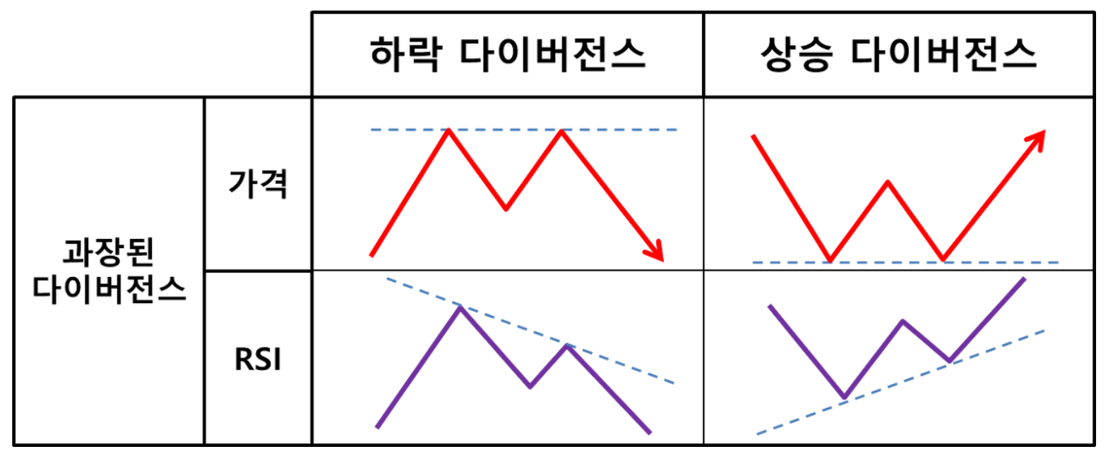과장된 하락 다이버전스는 종목의 고점은 비슷하지만, RSI의 고점은 내려가는 것으로 추세가 곧 하락 추세로 전환됨을 뜻한다. 과장된 상승 다이버전스는 종목의 저점은 비슷하지만, RSI의 저점은 높아지는 것으로 추세가 곧 상승 추세로 전환됨을 뜻한다.