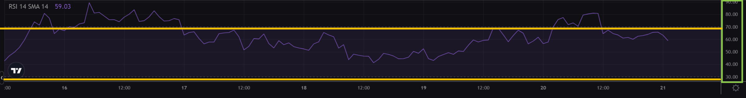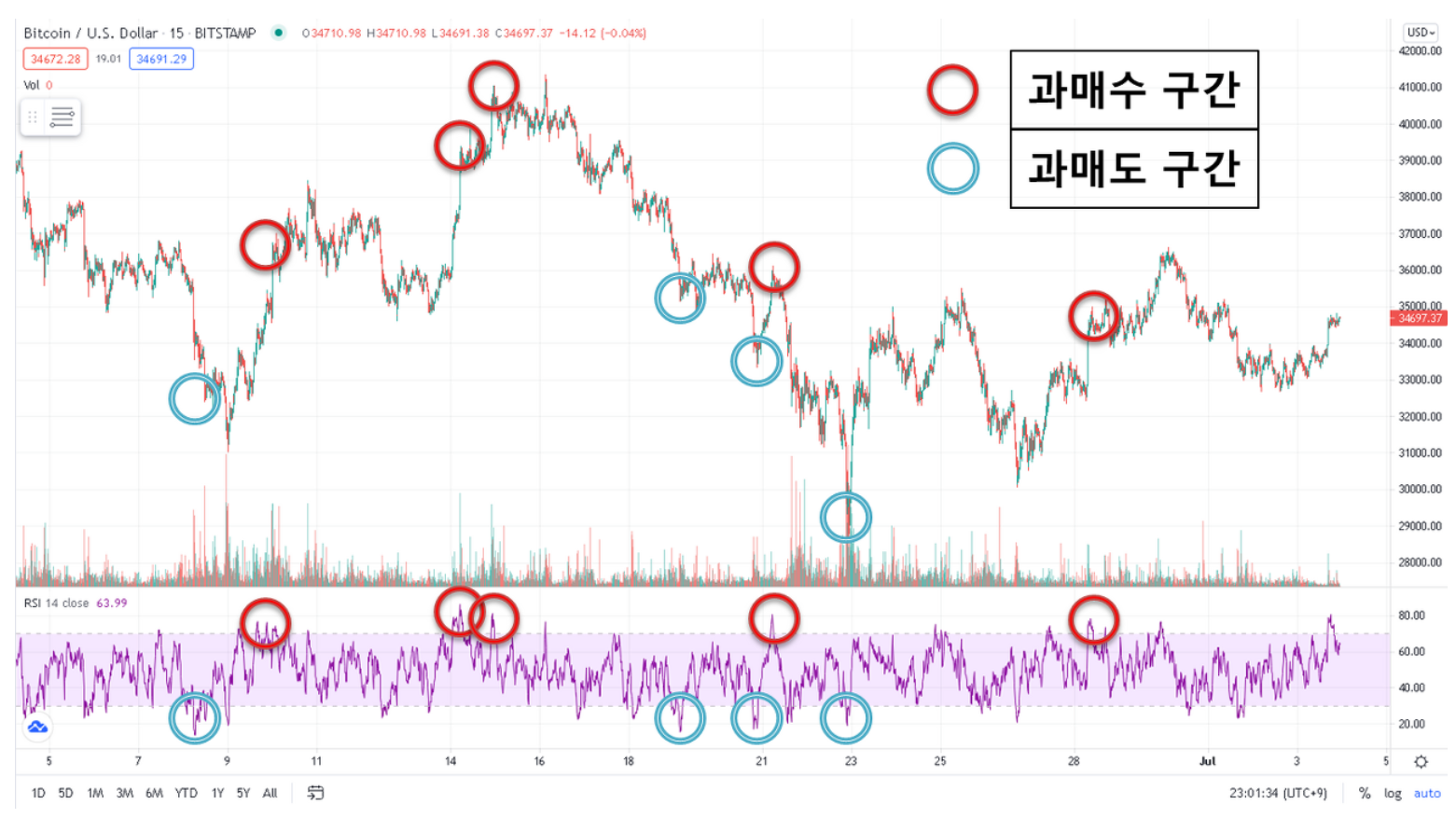 RSI는 1~100까지 사이의 값을 가지며 50을 기준으로 방향성을 파악하며 70이상이면 과매수 구간, 30이하이면 과매도 구간으로 본다. RSI를 볼때는 여러 시간으로 참고할 수 있다. 시간봉에 따라 추세가 다르게 보이기 때문에 주의해야한다.