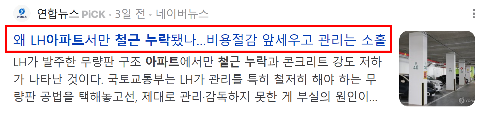 LH 아파트 철근 누락과 콘크리트 강도저하가 발견되서 전수조사를 했다. 생각보다 많은 곳에서 누락이 발견 되었고 LH는 부실시공이 이뤄진 단지들에 대해 보강공사를 실시한 후 정밀 안전점검도 진행할 예정이다.