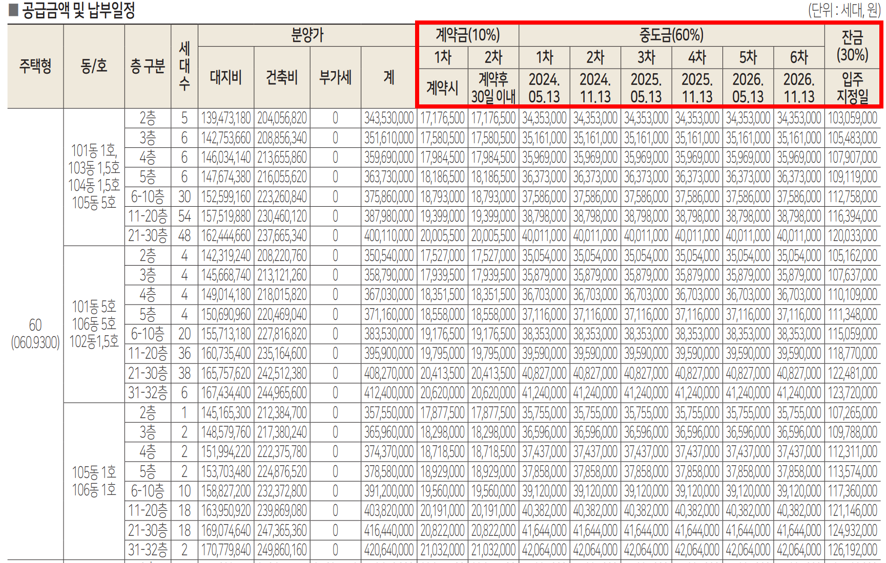 후분양은 계약시 5~10%를 지불하고 이후 중도금을 10~15%납입해야한다. 위의 공고는 1차때 5% 2차때 10%를 지불하는방식이다. 기간을 살펴보면 선분양은 6개월 마다 중도금을 6차에 걸쳤다면 후분양은 1차 중도금을 내고 두 달만에 2차 중도금을 지불하는 것을 확인할 수 있다.