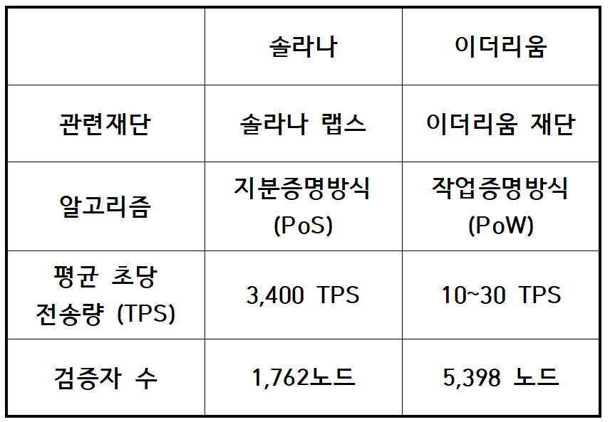 솔라나는 이더리움을 대체할 수 있는 암호화폐로 주목을 받았으며 이더리움은 블록체인상에서 스마트 컨트랙트 기술을 구현하였고 이러한 기술을 바탕으로 이더리움 디앱에서 파생되어 개발되었지만 여러가지 한계점이 있다. 이더러움의 대체제로 불리는 솔라나의 초당 전송량을 비교한 표가 위의 표이다.