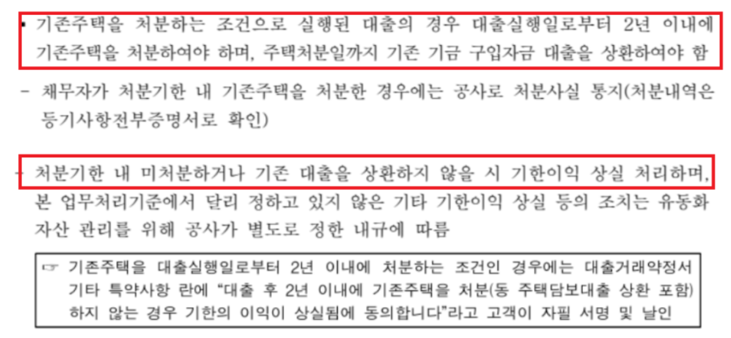 1주택 갈아타기는 기존 정책자금과 같이 처분조건부로 진행이 가능하며 대출실행일로부터 2년 이내에 기존주택을 처분해야한다. 만약 처분하지 않을경우 기한이익 상실 조치로 대출원금 전액을 상환해야한다.