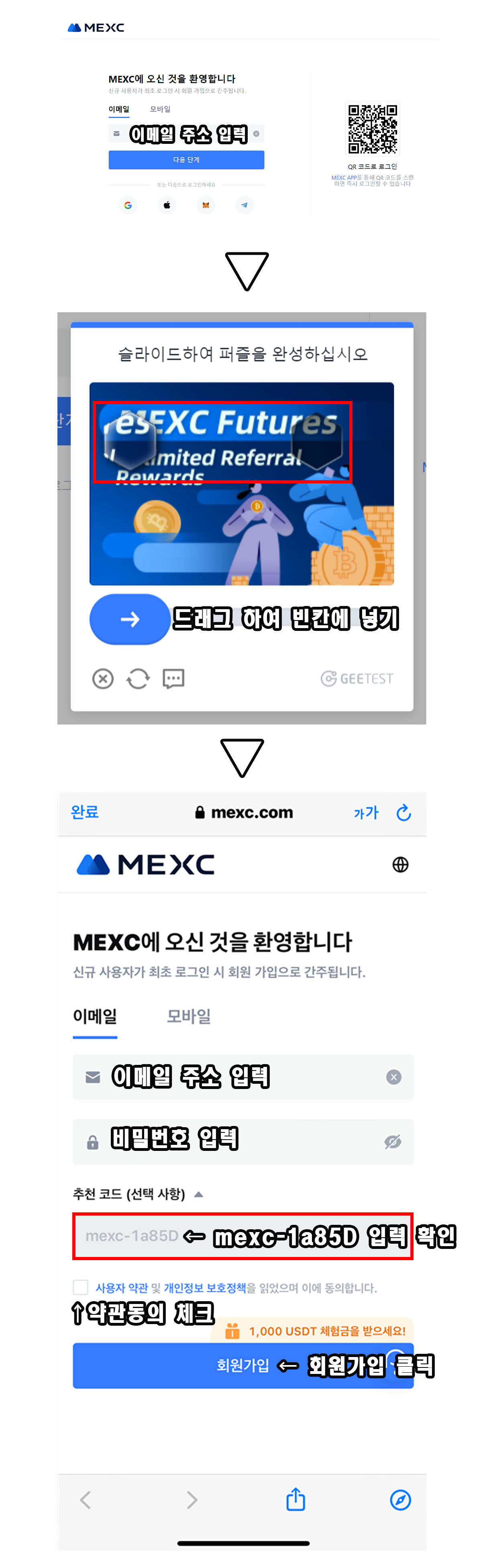 다시 한번 이메일 주소와 비밀번호 입력창이 나오면 순서대로 기입하고 아래쪽 추천코드에 mexc-1a85D를 확인하고 약관 동의에 체크한 후 '회원가입'버튼을 눌러줍니다.
