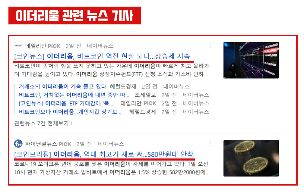 현재 가상화폐 시장에서 대다수의 코인들이 박스권에 갇혀 있는 상태고 오미트론 이슈가 다시 유동성에 변화를 줄 수 있다는 우려가 대두되고 있다. 이러한 부정적인 이슈들은 암호화폐에 악재로 작용할 수 있으나 이더리움 시세는 나홀로 불장을 만들면서 업비트나 빗썸에서 연사적인 신고가인 590만원을 찍었다.