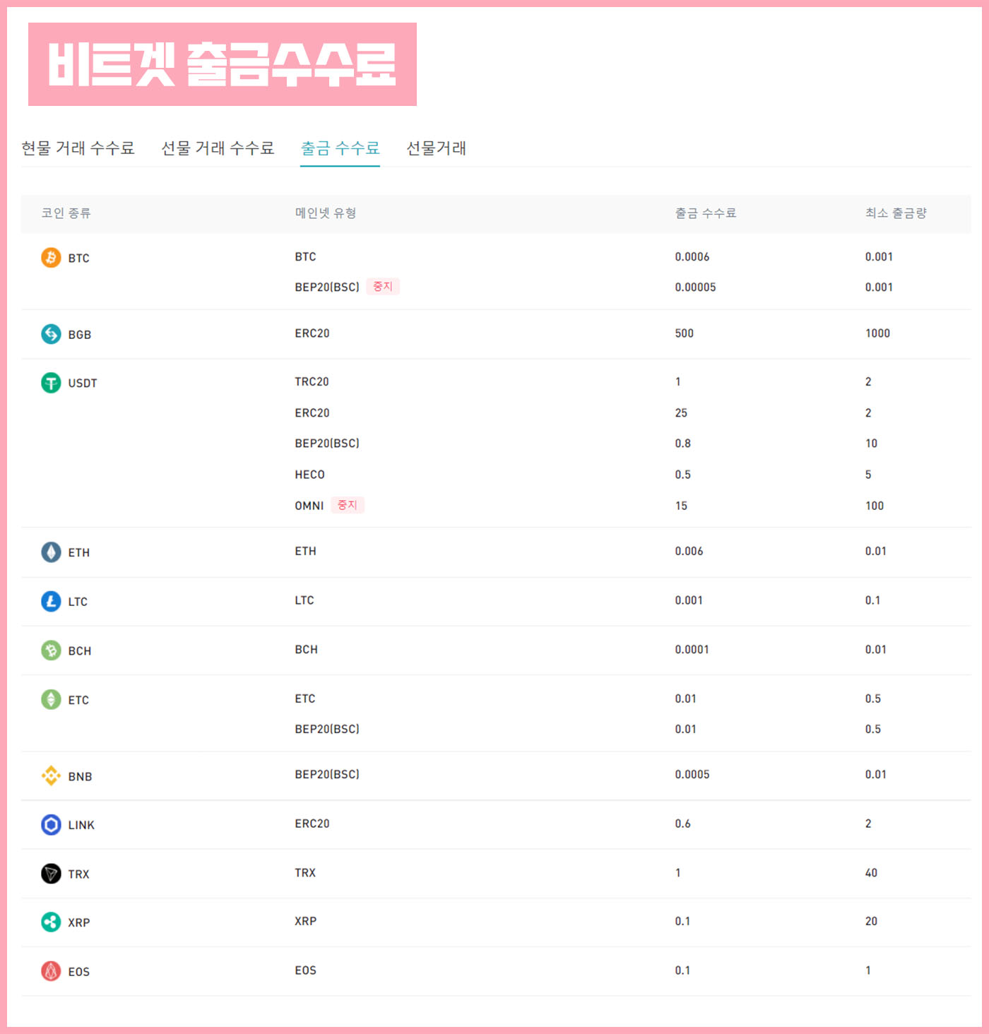 비트겟에서 다른 거새소 혹은 외부로 가상화폐를 출금하는 경우 출금 수수료가 부과되며 이오스(EOS), 리플(XRP), 트론(TRX) 출금수수료는 다른 가상화폐에 비하여 상당히 저렴하여 출금 시 해당 가상화폐를 이용하는 것을 추천한다.